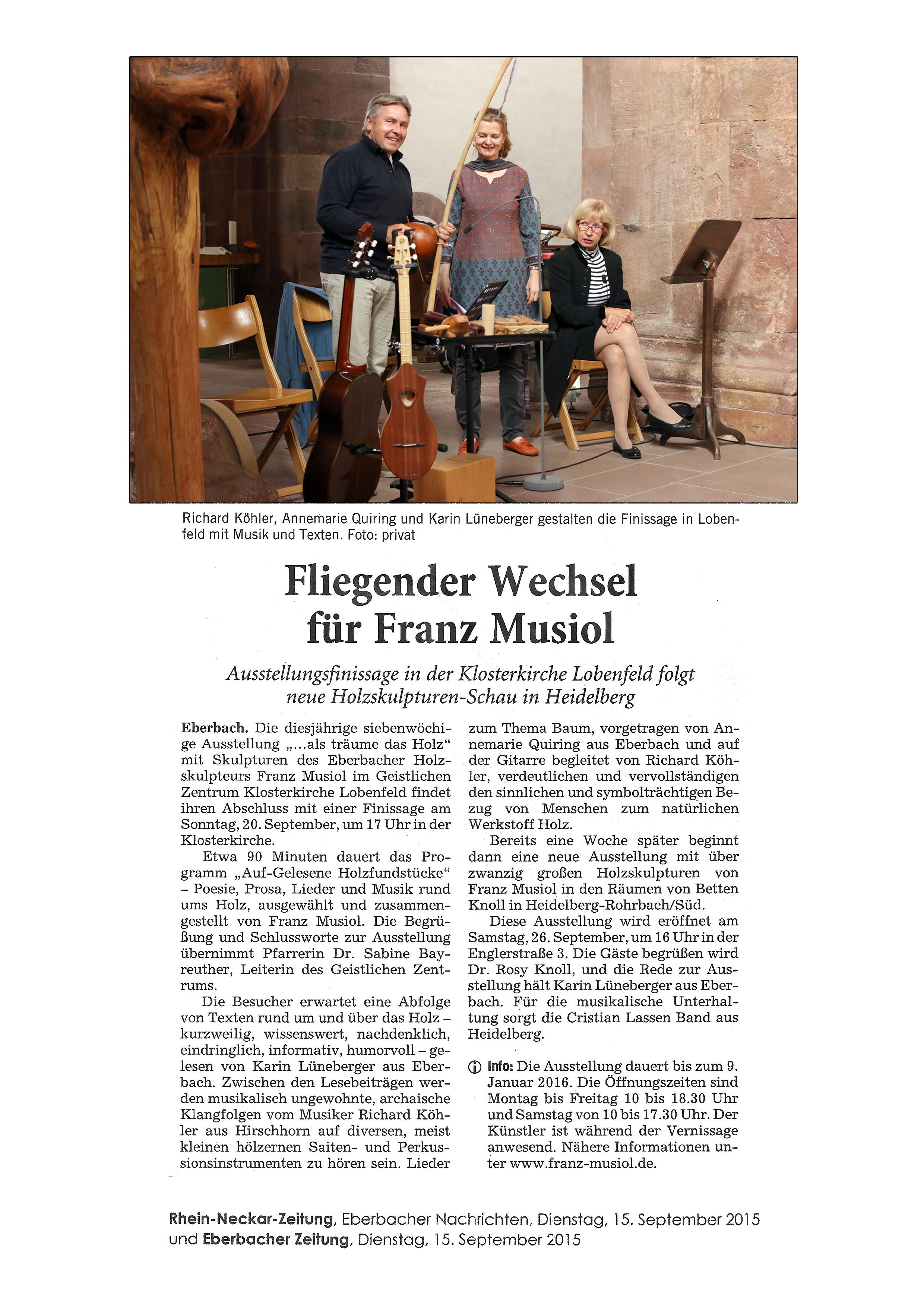 Die diesjährige 7-wöchige Ausstellung „ … als träume das Holz.“ mit Skulpturen des Eberbacher Holzskulpteurs Franz Musiol im Geistlichen Zentrum Klosterkirche Lobenfeld findet ihren Abschluss mit einer Finissage am 20. September um 17 Uhr in der Klosterkirche.Etwa 90 Minuten dauert das Programm „Auf-Gelesene Holzfundstücke“ – Poesie, Prosa,Lieder und Musik rund ums Holz. Ausgewählt und zusammengestellt von Franz Musiol. Die Begrüßung und Schlussworte zur Ausstellung übernimmt Pfarrerin Dr. Sabine Bayreuther, Leiterin Geistliches Zentrum Klosterkirche Lobenfeld. Die Besucher erwartet eine abwechslungsreiche Abfolge von allerlei Texten rund ums und über das Holz – kurzweilig, wissenswert,nachdenklich, eindringlich, informativ, humorvoll. Gelesen von Karin Lüneberger aus Eberbach.